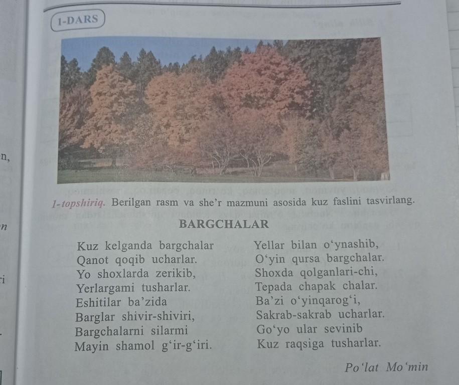 Ответ: Mana Oltin kuz ham kirib keldi. Daraxtlardagi bargchalar sarĝayib tòkilishni boshladilar. Ular tòkilib katta oltin gilam hosil qilishdi. Òrmon sariq, qizil , malla va sabzirangga tuslandi. Har-har zamon shamol esib turibdi. Va barglarni daraxtdan daraxtga uchirib turibdi. Gòyo ular kuz raqsiga tushgandek uchishar edilar.