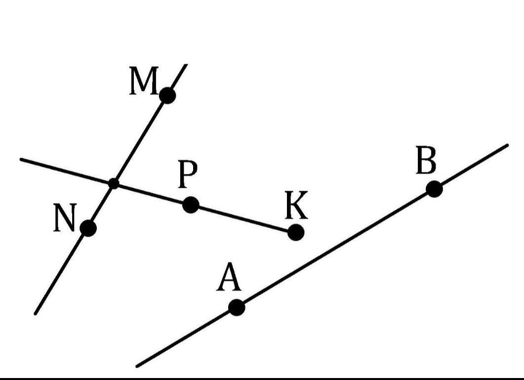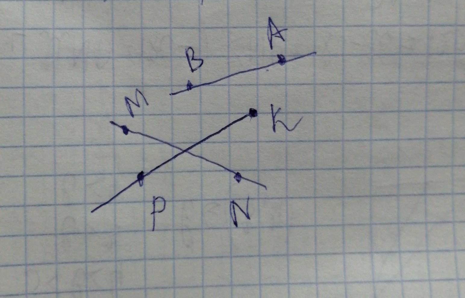 отметьте точки P и K и Проведите Луч KP Начертите прямую MN пересекающую Луч KP и прямую AB не пересекающую луч kr