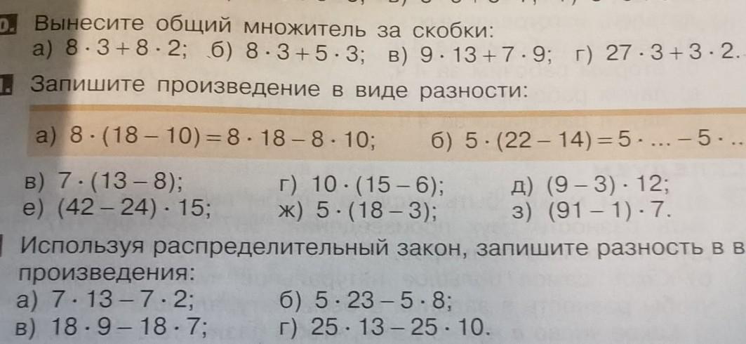 Используя распределительный закон, запишите разность в виде произведения:( 7*13-7*2) и тд