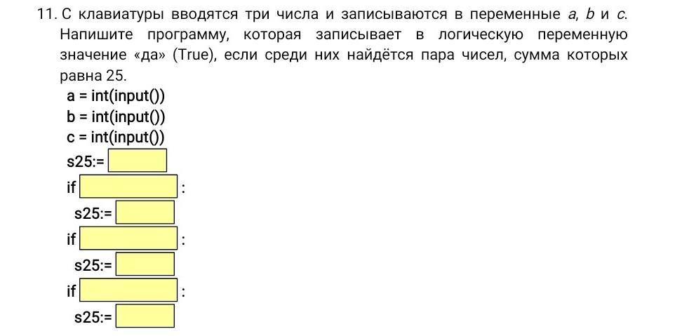 11) С клавиатуры вводятся три числа и записываются в переменные a, b и c. Напишите программу, которая записывает в логическую переменную значение «да» (True), если среди них найдётся пара чисел, сумма которых равна 25.
