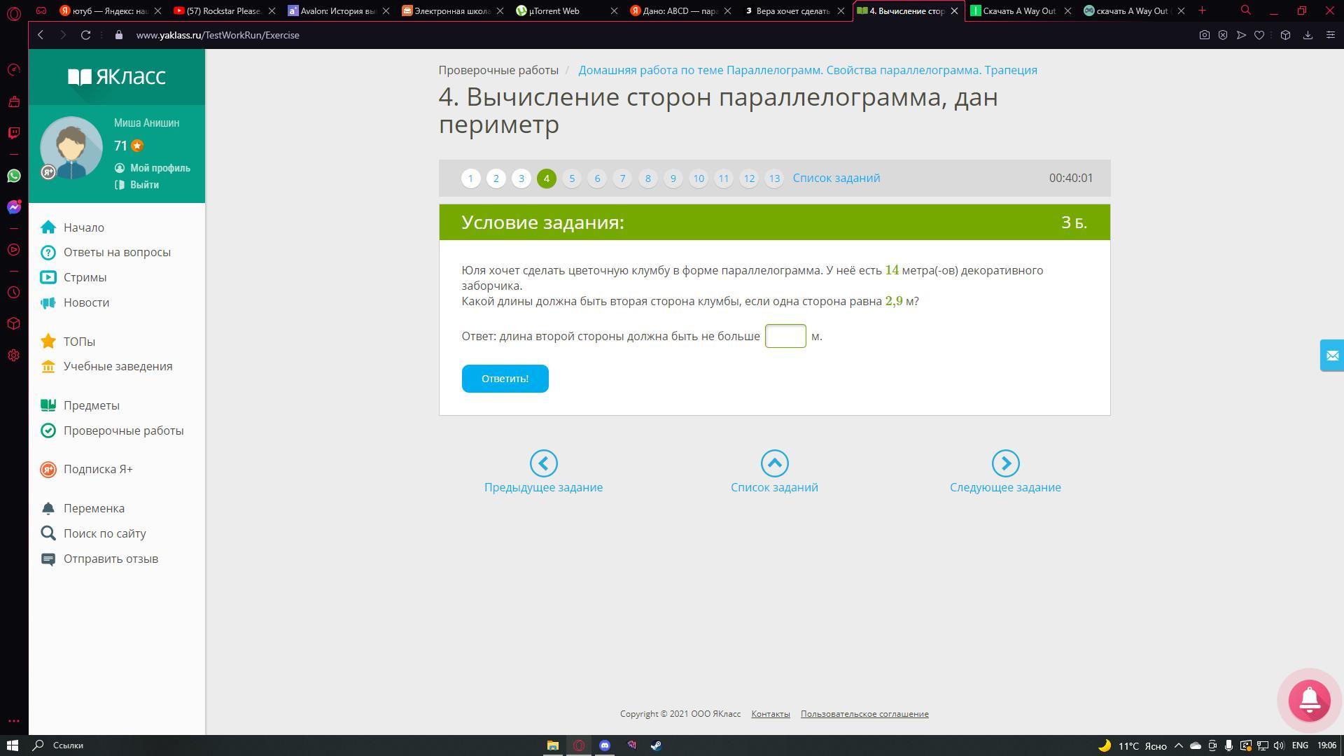 Какой длины должна быть вторая сторона клумбы, если одна сторона равна 2,9 м?
