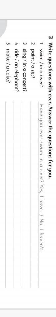 3 Write questions with ever. Answer the questions for you. 1 swim / in a river? 2 paint/a set? 3 sing/in a concert? 4 ride / an elephant? 5 make/ a cake?