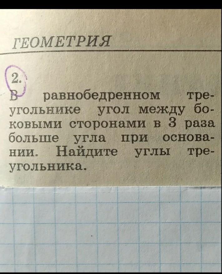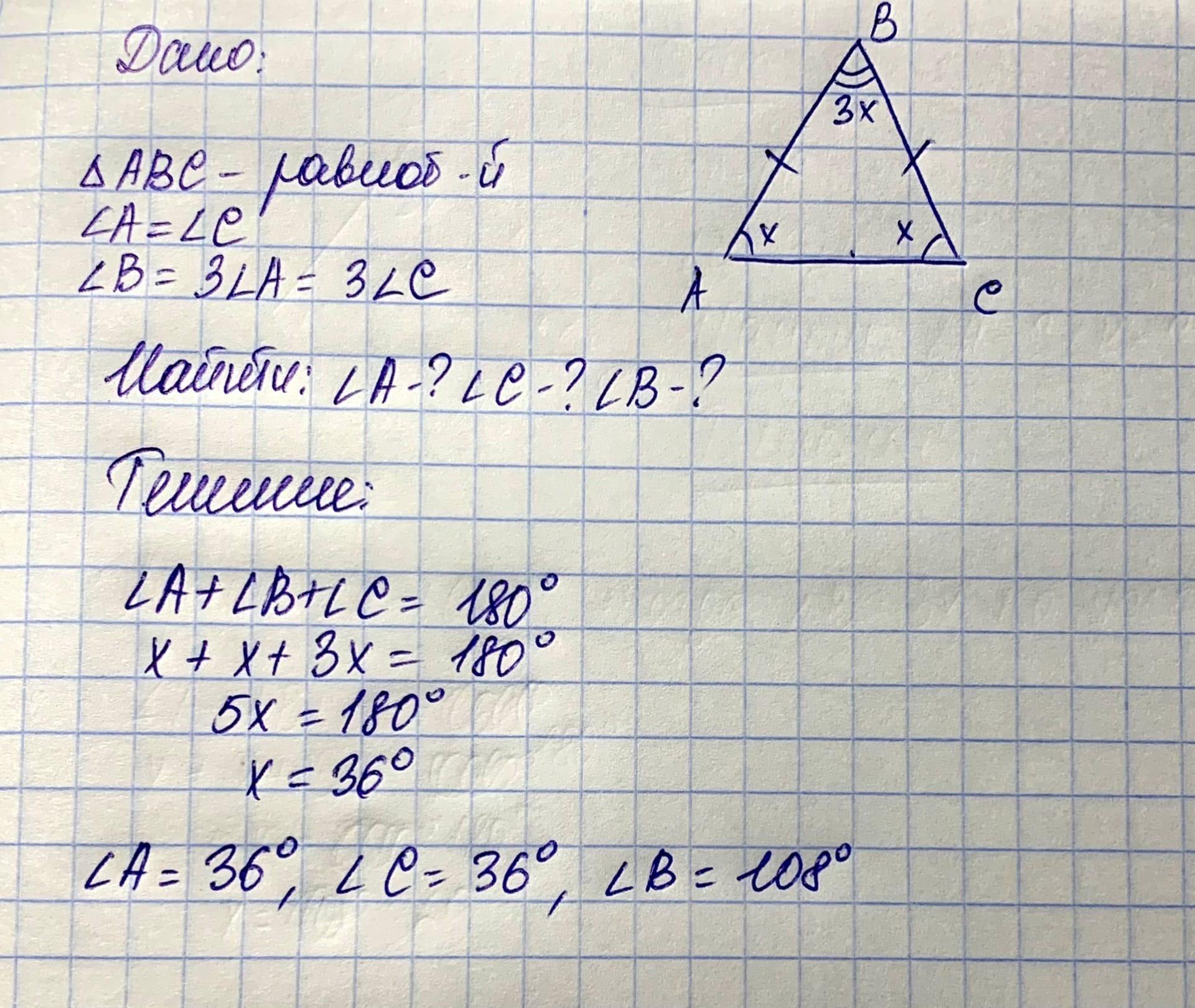 По условию ∠A=∠C, а ∠B в 3 раза больше угла при основании.