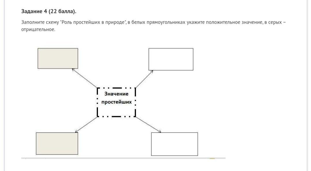Заполните схему "Роль простейших в природе", в белых прямоугольниках укажите положительное значение, в серых – отрицательное