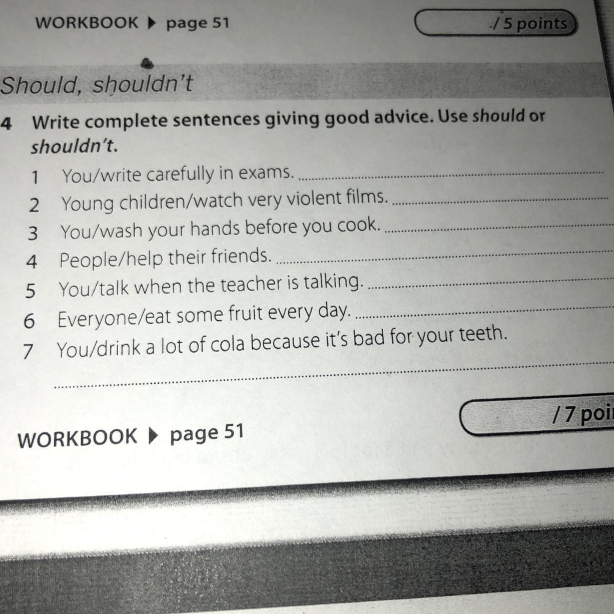 1) should, 2) shouldn’t, 3) should, 4) should, 5) shouldn’t, 6) should, 7) shouldn’t