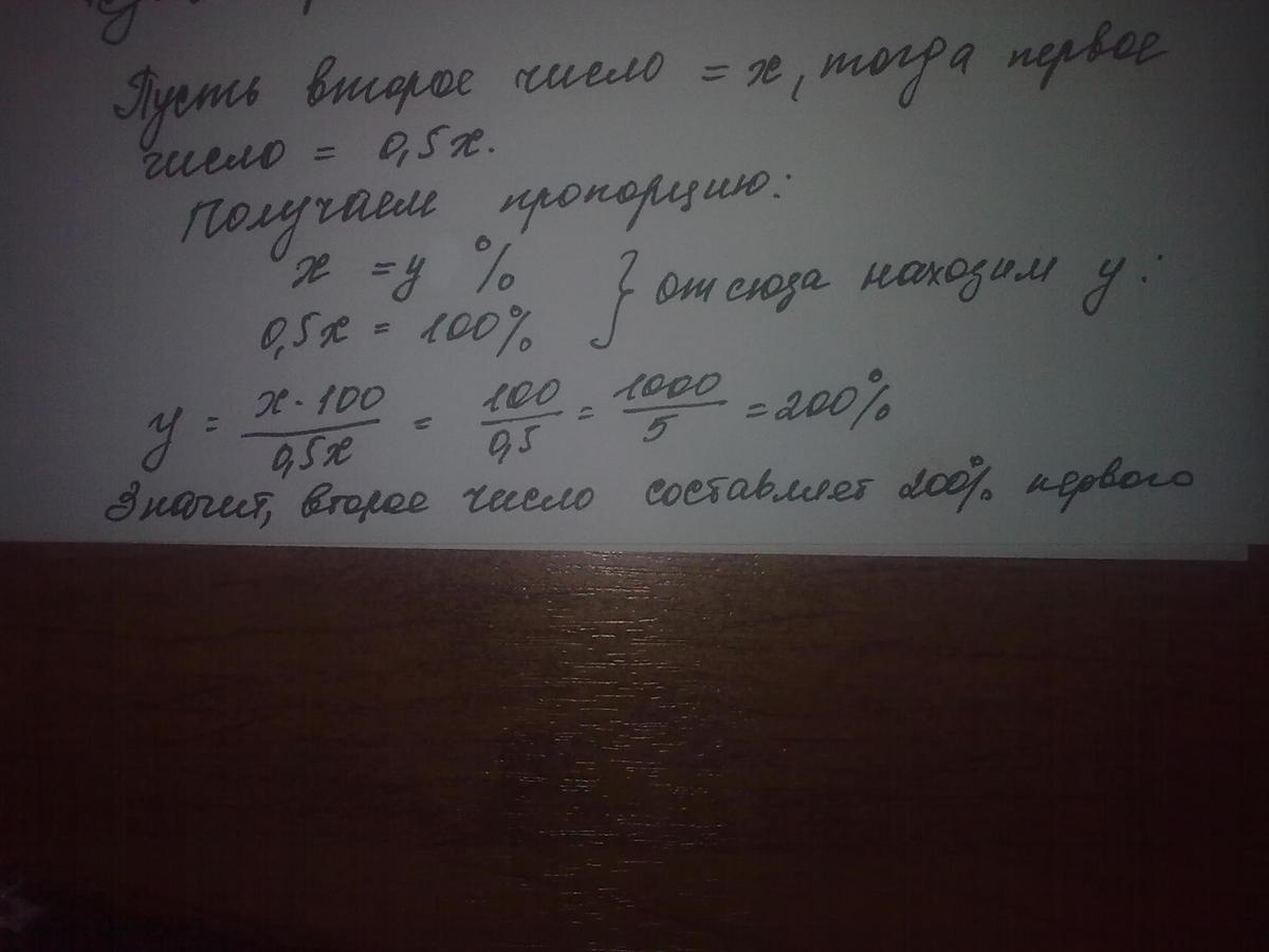 Обозначим второе число через х, тогда первое число равняется 0,5х. Чтобы узнать, сколько процентов составляет число х от числа 0,5x; составим пропорцию: