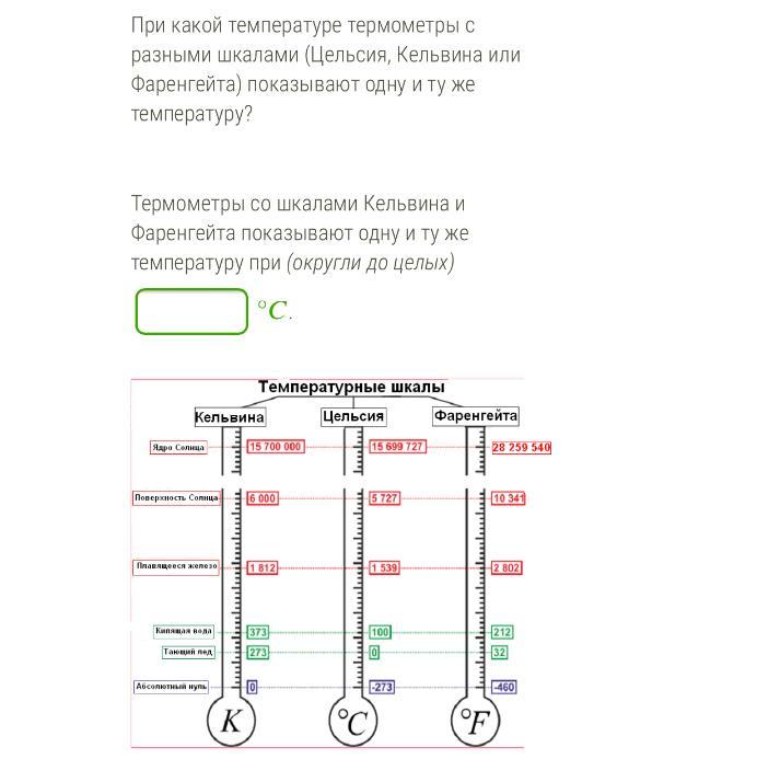 Термометры Цельсия и Фаренгейта показывают одинаковую температуру при - 40°С = - 40°F
