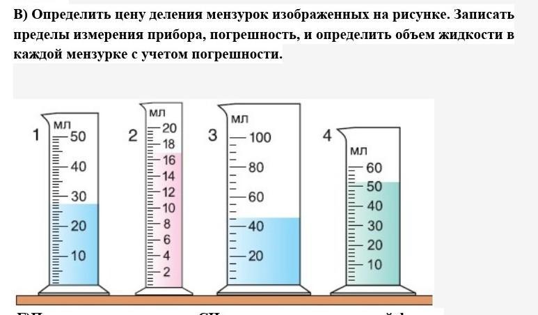 В) Определить цену деления мензурок изображенных на рисунке. Записать пределы измерения прибора, погрешность, и определить объем жидкости в каждой мензурке с учетом погрешности.
