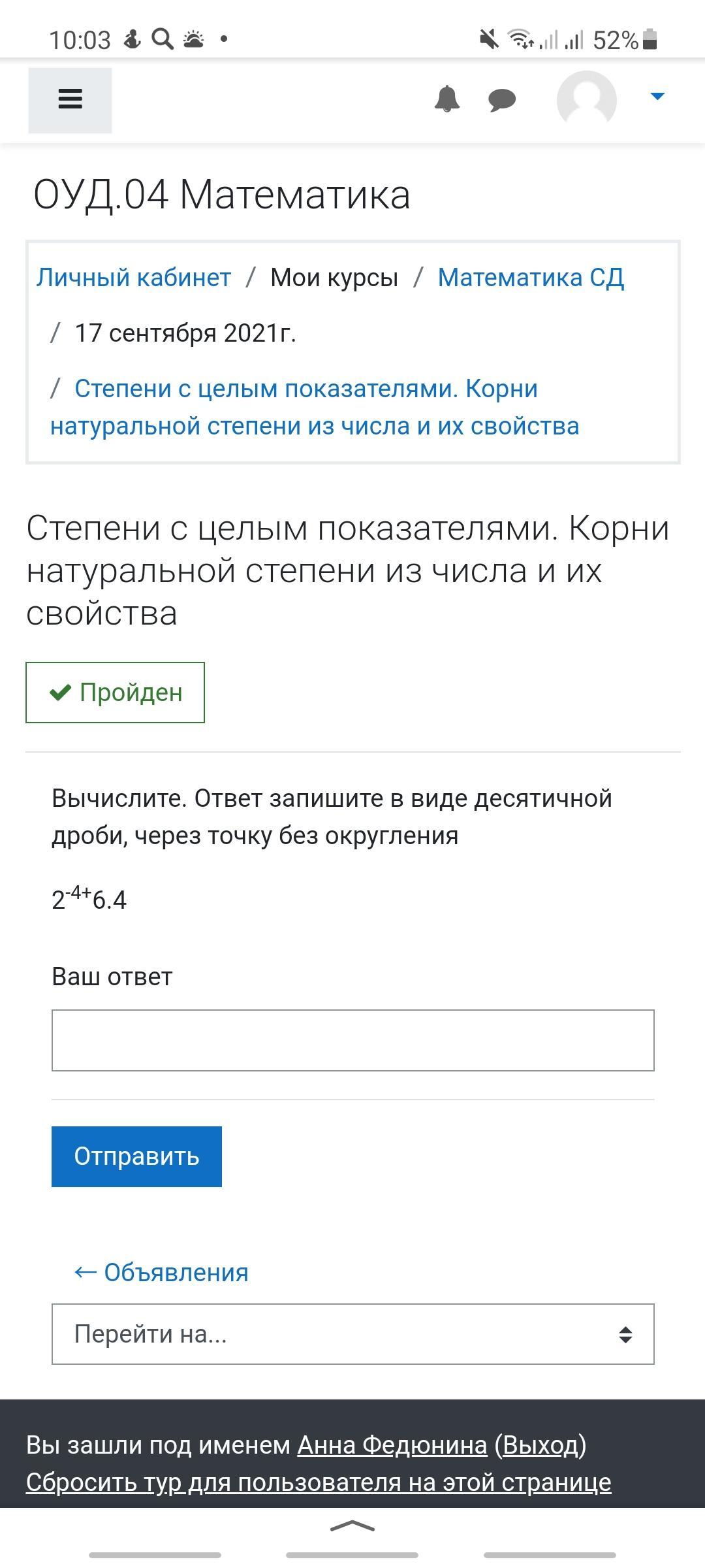 Вычислите. Ответ запишите в виде десятичной дроби, через точку без округления