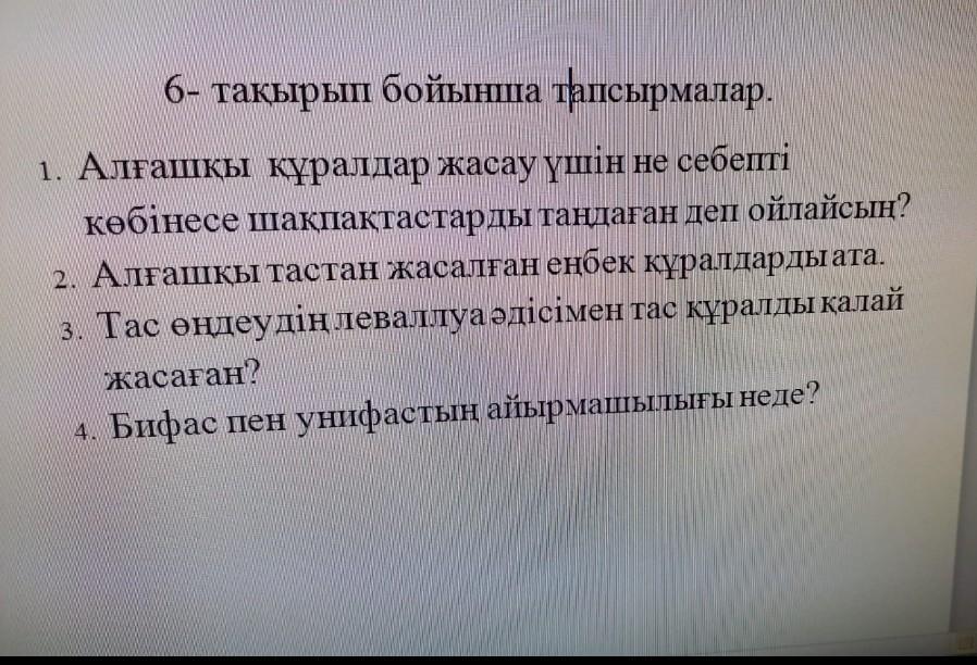 2қазғыштаяқ,үшкір тас,шоқпар,монофас және т.б