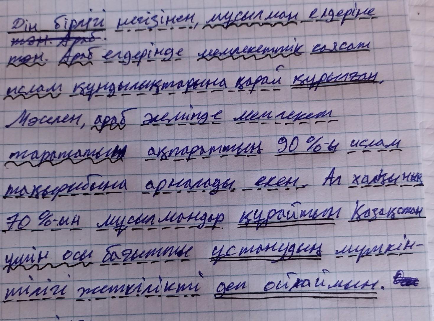қазақ тілі 9 сынып, 18 бет. Дін бірлігі негізінен, мұсылман елдеріне тән. Араб елдерінде мемлекеттік саясат ислам құндылықтарына қарай құрылған. Мәселен, араб әлемінде мемлекет тарататын ақпараттың 90%-і ислам тақырыбына арналады екен. Ал халқының 70%-ін мұсылмандар құрайтын Қазақстан үшін осы бағытты ұстанудың мүмкіншілігі жеткілікті деп ойлаймын. Осы мәтінге синтаксистік талдау жасау. Көмек керек