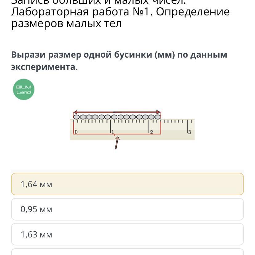 Вырази размер одной бусинки (мм) по данным эксперимента.