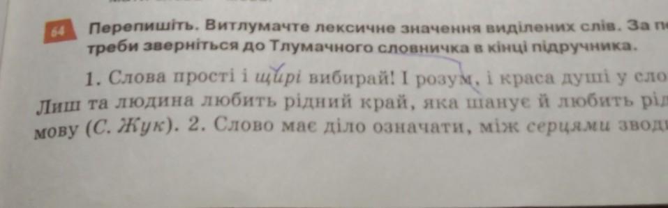 64 Перепишіть. Витлумачте лексичне значення виділених слів. За по- треби зверніться до Тлумачного словничка в кінці підручника. 1. Слова прості і щирі вибирай! І розум, і краса душі у слові. иш та людина любить рідний край, яка шанує й любить рідну ову (С. Жук). 2. Слово має діло означати, між серцями зводить .