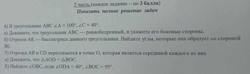 б)По условию точка О делит прямые СD и АВ пополам и если образовались треугольники АОD и СОВ,то они равны по первому признаку равенства треугольников-по двум сторонам и углу между ними