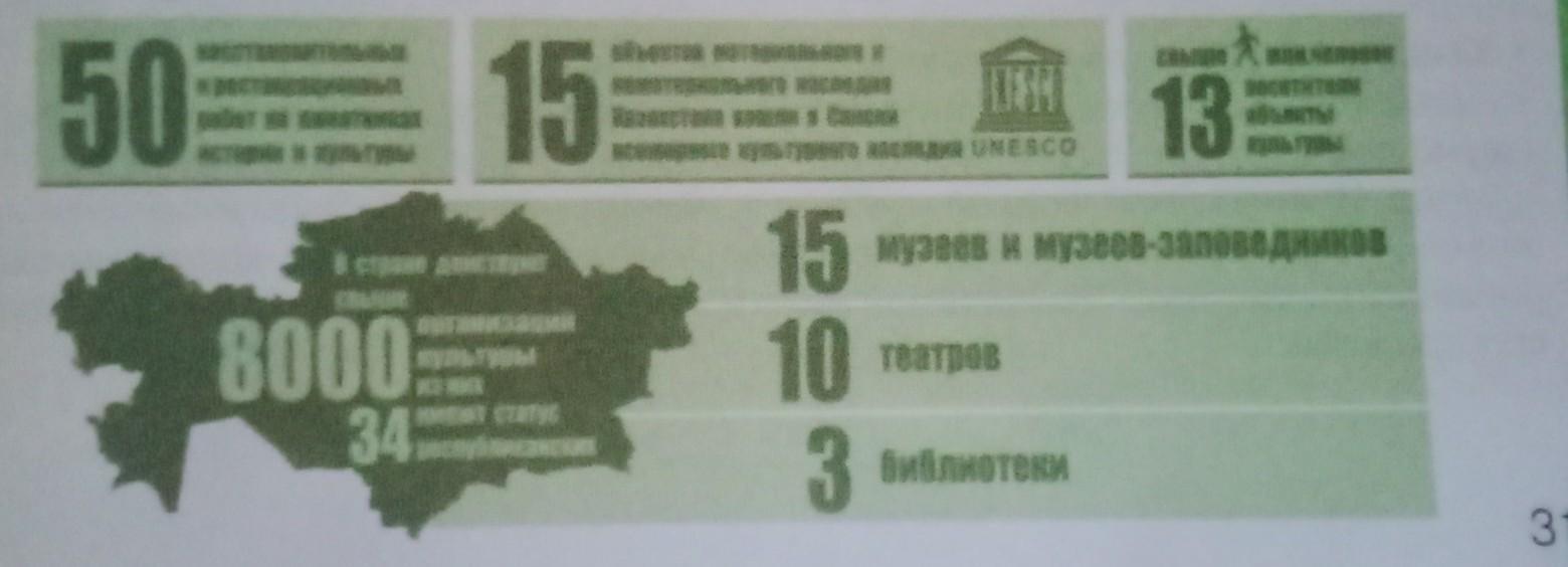 3. Рассмотрите инфографику. Расскажите, какие организации культуры существуют в Казахстане. Подберите несколько словосочетаний, синонимичных словосочетанию «культурное наследие». Составьте правила поведения в музее-заповеднике, театре или библиотеке.