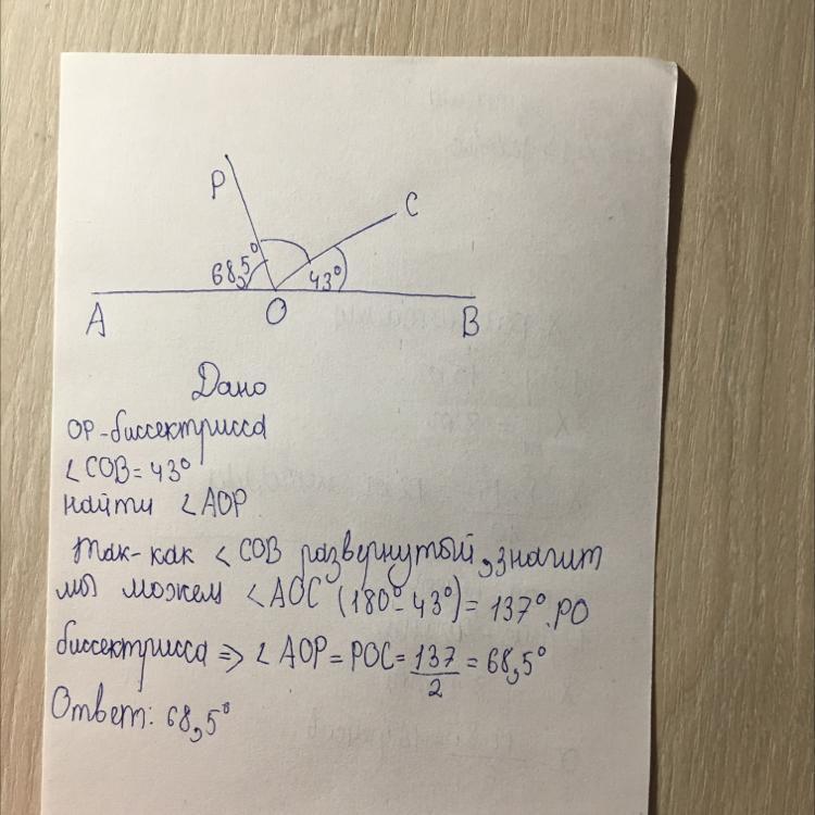 найдите величину угла AOP, если OP- бис. угла AOC, угол COB = 43 градуса. Ответ дайте в градусах.