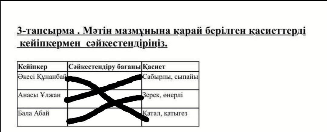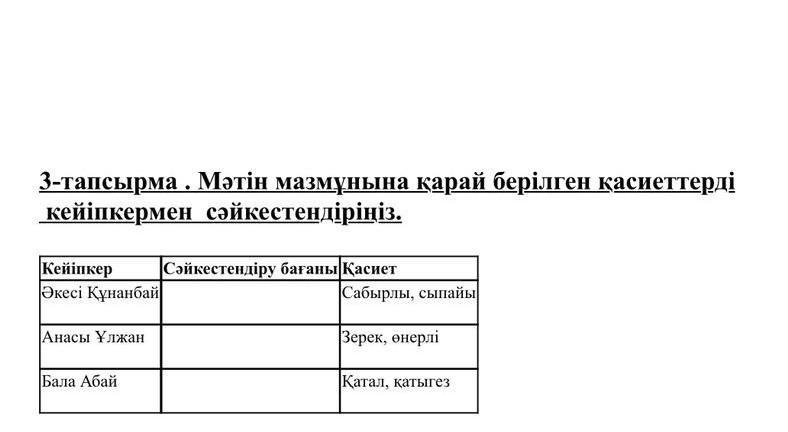 3 - тапсырма . Мәтін мазмұнына қарай берілген қасиеттерді кейіпкермен сәйкестендіріңіз . | кейіпкер Сәйкестендіру бағаны қасиет Әкесі Құнанбай Сабырлы , сыпайы Анасы Ұлжан Верек , енерлі Бала Абай қатал , қатыгез