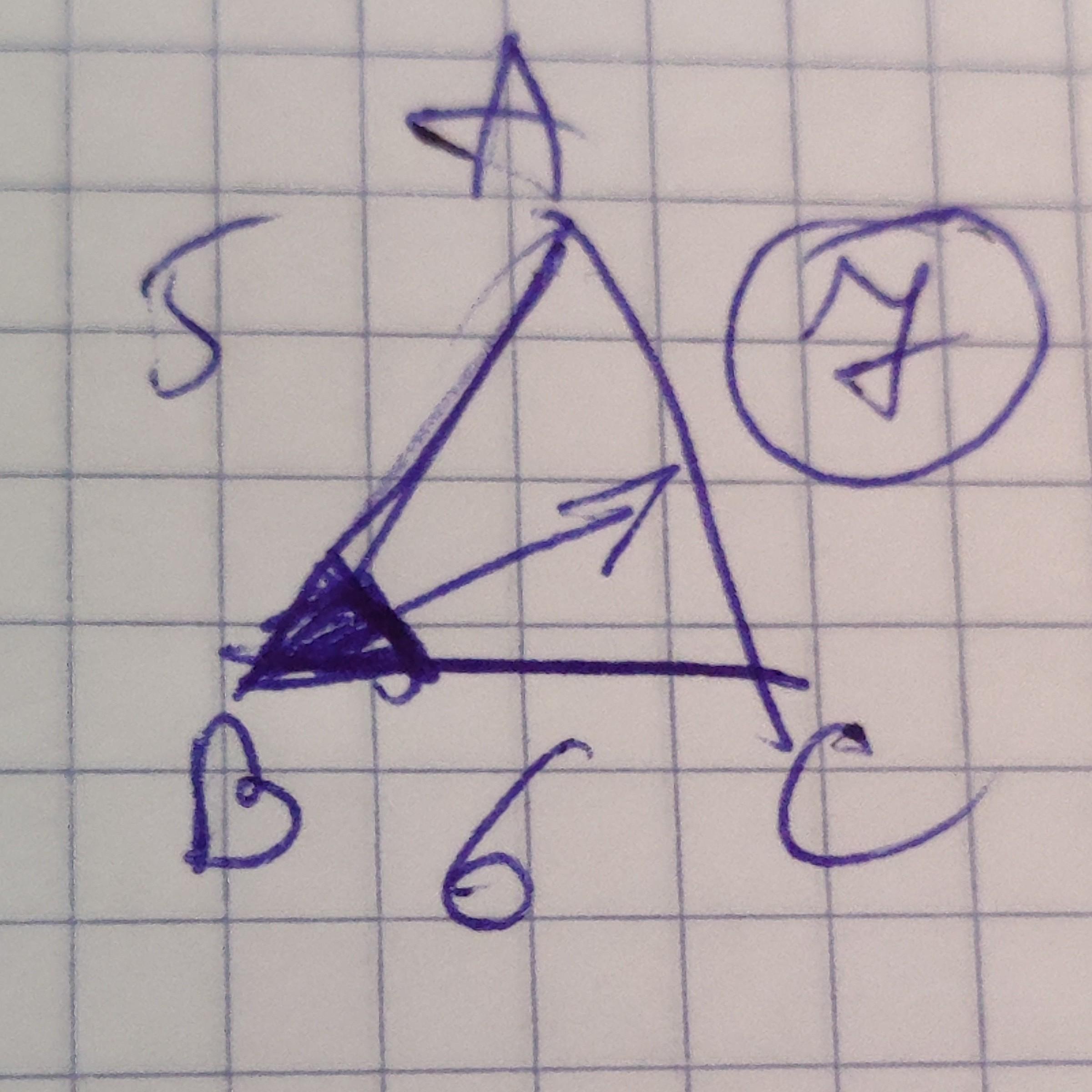 Напротив большой стороны, находиться и самый большой угол. Представив этот треугольник на рисунке, мы получим BAC как самый большой угол, так как напротив него сторона в 7 см, а наименьшим углом будет считаться АСВ, так как напротив него находится сторона в 5 см.