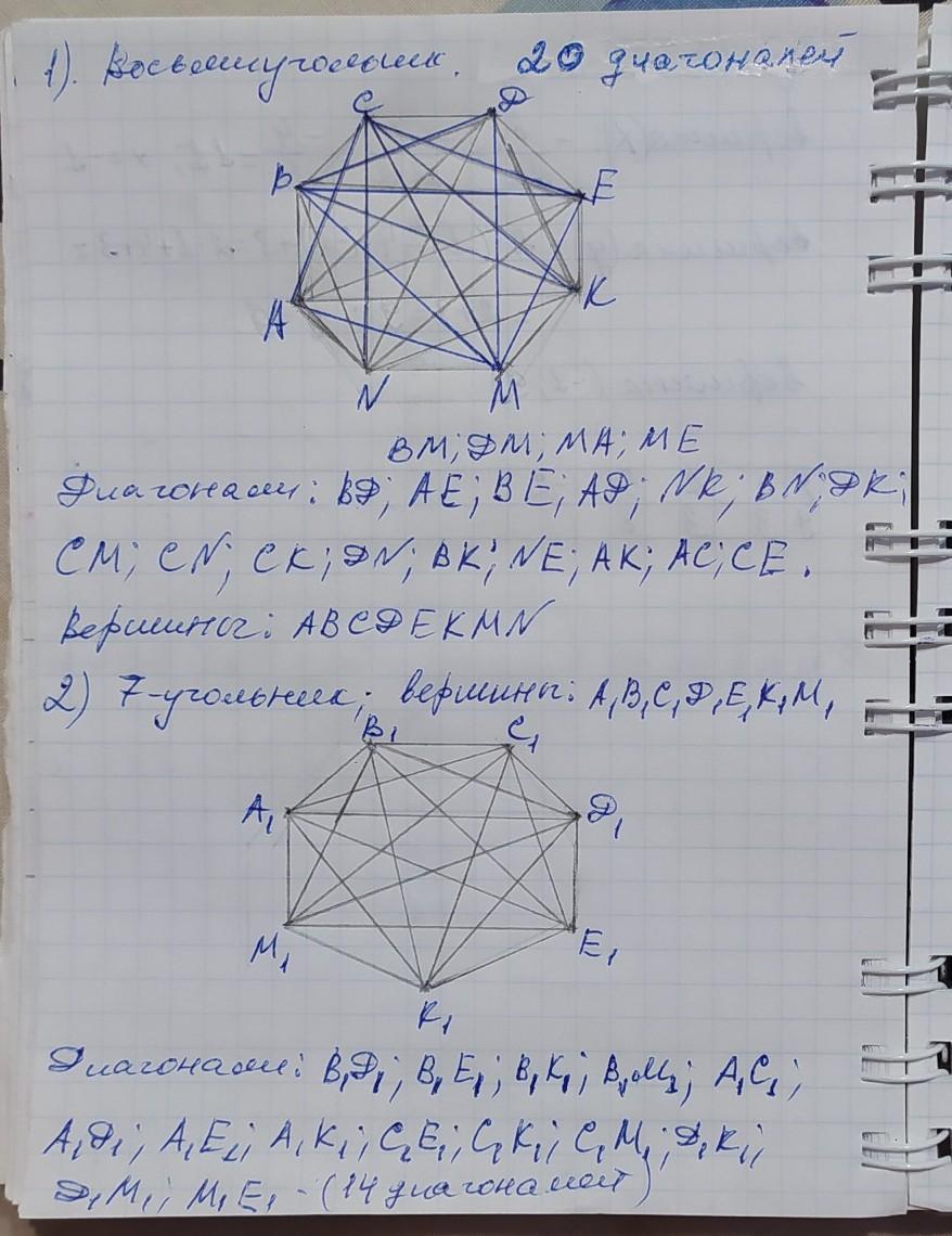 Чертите сами, вершины сами. Диагонали (n²-3n)/2 где n- количество сторон. (7²-3*7)/2=(49-21)/2=14 количество диагоналей в семиугольнике.