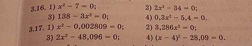 1) x2 - 7 = 0; 3) 138 - 3x2 = 0; 1) x2 - 0,002809 = 0; 3) 2x2 - 48,096 = 0; 2) 2x2 - 34 = 0; 4) 0,3x2 - 5,4 = 0. 2) 3,286x2 = 0; 4) (x - 4)2 - 28,09 = 0.срочно помогите