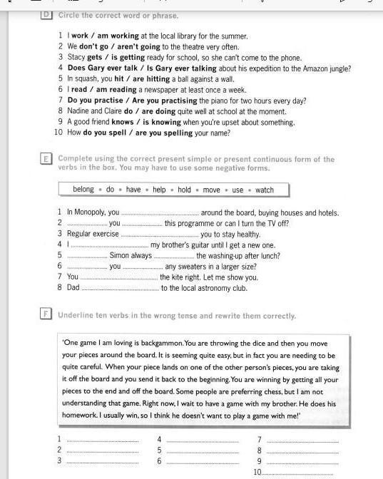 One game I LOVE is backgammon You Throw the dice and then you move your pieces around the board. It SEEMS quite easy, but in fact you NEED to be quite careful. When your piece lands on one of the other person's pieces, you TAKE it off the board and you send it back to the beginning.You WIN by getting all your pieces to the end and off the board. Some people PREFER chess, but l DON’T UNDERSTAND that game. Right now, I AM WAITING to have a game with my brother. He IS DOING his homework. I usually win, so I think he doesn't want to play a game with me!