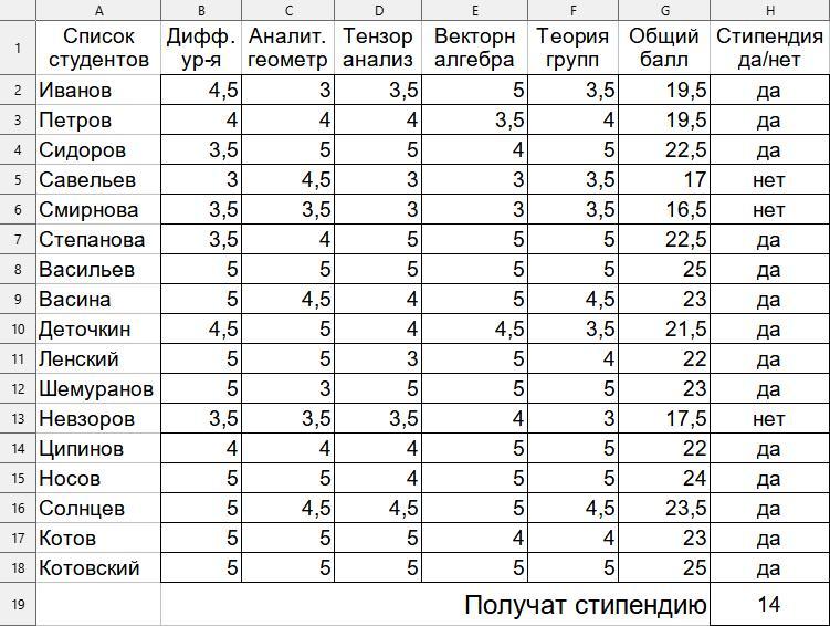 2в) Формула =(G2>=18)+0 (тут в скобках стоит выражение, которое даёт логическое значение ИСТИНА, если число в ячейке G2 больше или равно 18, а в противоположном случае- даёт значение ЛОЖЬ). Затем эти логические значения преобразуются в числа 1 либо 0 (путём сложения с нулём), и эти числа и отображаются как ответы в столбце (вместо да или нет). При этом, расчёт Получат стипендию делается формулой =СУММ(H2:H18) которая считает сумму в указанном диапазоне.