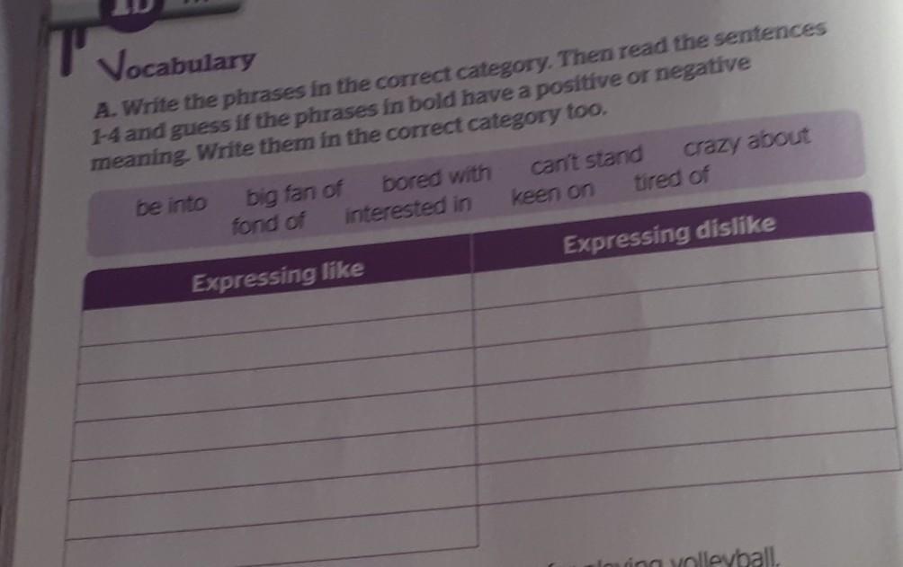 Write the phrases in the correct category. Then read the sentences 1-4 and guess if the phrases in bold have a positive or negative meaning. Write them in the correct category too.