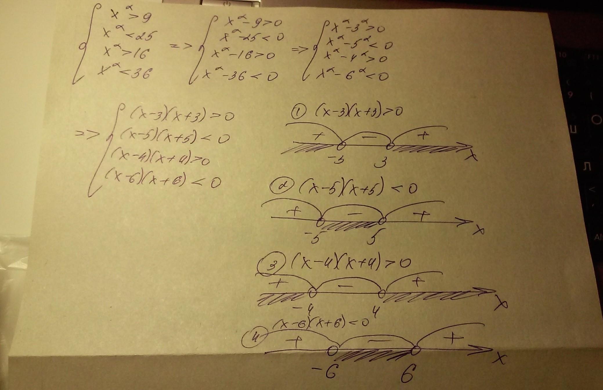 при каких значениях х значение функции y=x2 будет:1)больше 9;2) больше 25; 3) меньше 16; 4) меньше 36