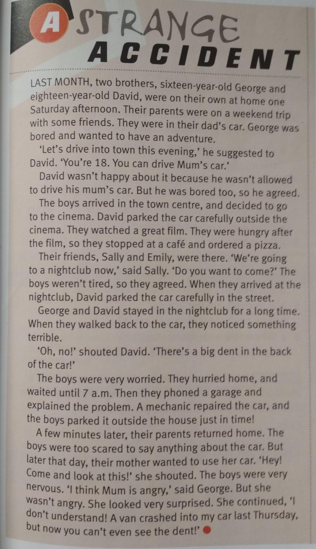 One Saturday afternoon, the parents of George and David went to their friends. George became very bored. He invited his eighteen-year-old brother to get behind the wheel of his mother's car. David was against it because he wasn’t allowed to drive his mother's car. Then he agreed and the boys drove to the city center. David carefully parked the car and the boys went to the cinema. After watching the movie, they went to the pizzeria. At the pizzeria, they met Sally and Emmily, who invited them to go to the club. Everyone went to the club together. Leaving the club, they saw a big dent in the car. Early in the morning, they called the car service. The mechanic quickly removed the dent. After the return of their parents, the boys were very scared. Mom called them and said that a van drove into the car last week and left a dent, but now it's gone.