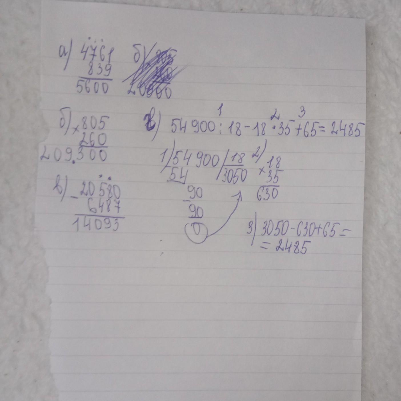 1 Вычислите: a.) 839 +4761; в.) 260 * 805; 6.) 20 580 - 6487; r.) 54 900 : 18 - 18 * 35 + 65.