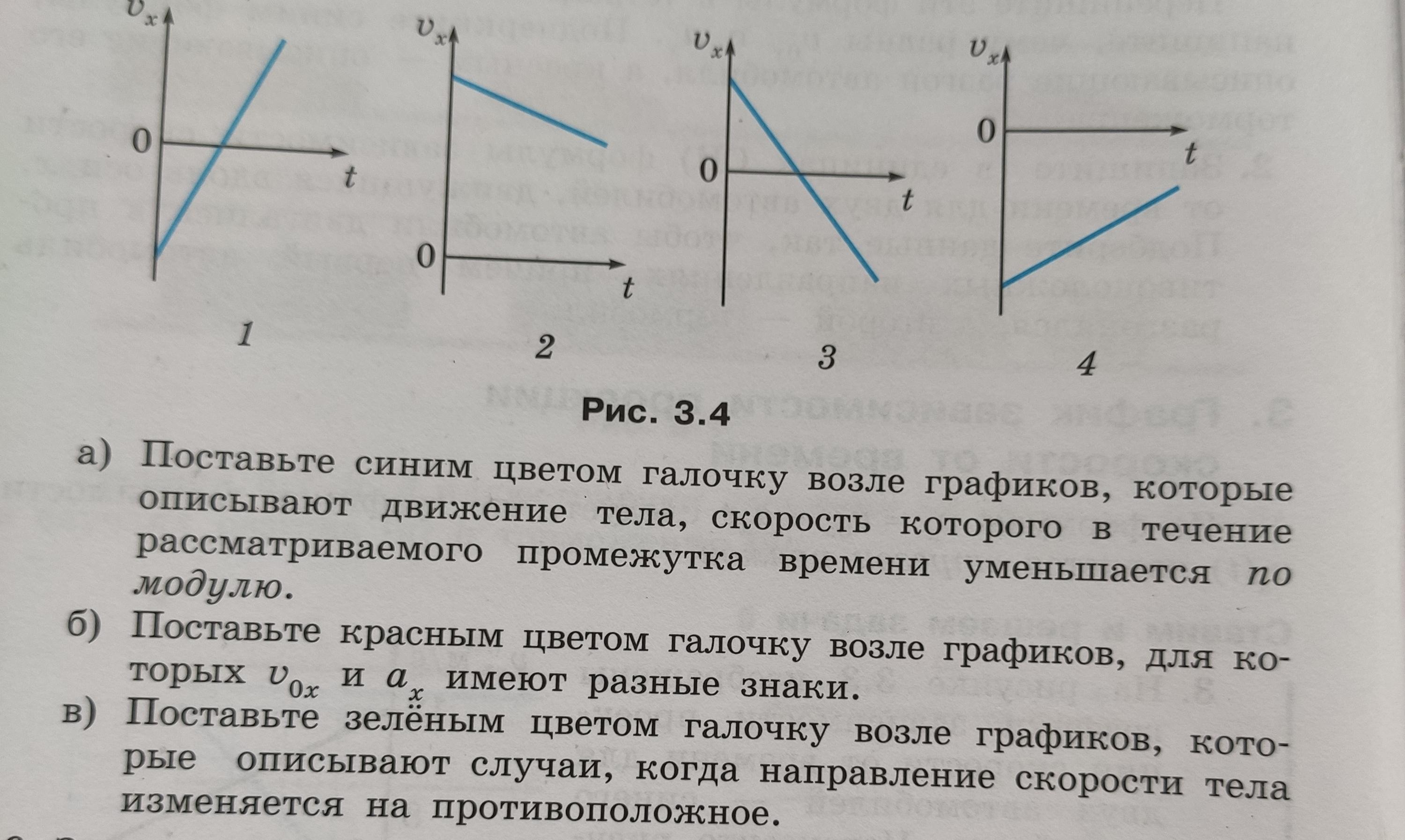 На рисунке 3.4 изображены графики зависимости проекции скорости от времени для четырех тел, движущихся вдоль оси x.