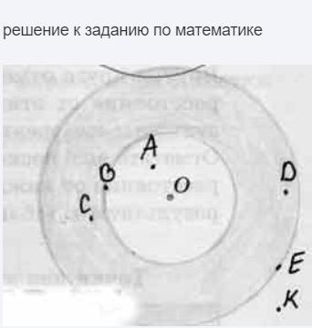 Отметьте точки A, B, C, D, E, K, рас- положенные соответственно на расстоянии 5 мм, 1 см, 1 см 3мм, 1 см 8 мм, 2 см, 2 см 4 мм от точки 0. Закрасьте область, все точки которой расположены от точки она расстоянии, большем 1 см и меньшем 2 см.