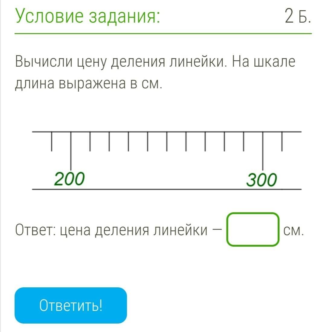 100:10=10см - цена деления(она палачка это 10см)