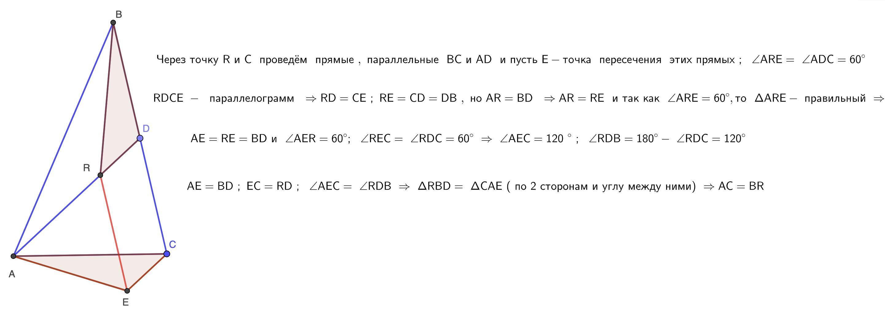 На медиане AD треугольника ABC Маша выбирает такую точку R, что AR = BD и замечает, что ∠ADC =