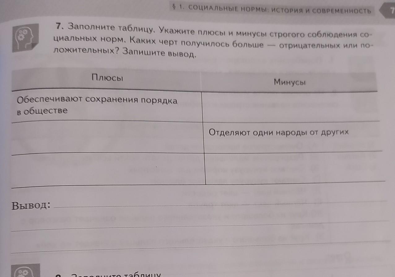 7. Заполните таблицу. Укажите плюсы и минусы строгого соблюдения со циальных норм. Каких черт получилось больше отрицательных или по- ложительных? Запишите вывод.