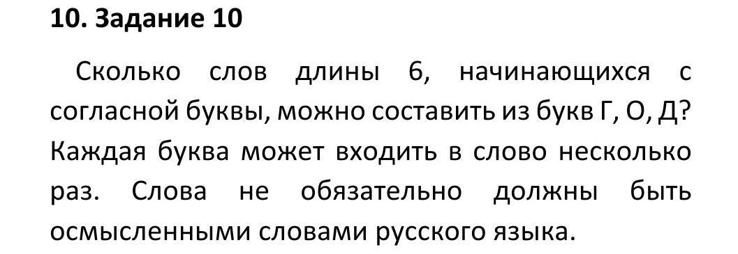 Среди данных букв 2 согласных. Таким образом на первой и последней позициях может стоять одна из 2 букв. На оставшихся 4 позициях может стоять любая из 3 букв. То есть всего имеем 2 умножить на 3 в степени 4 умножить на 2 = 324 комбинации.
