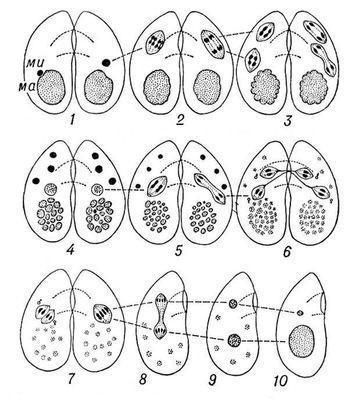 На этом этапе одно из ядер (их всего 2) становится макронуклеусом, другое — микронуклеусом.