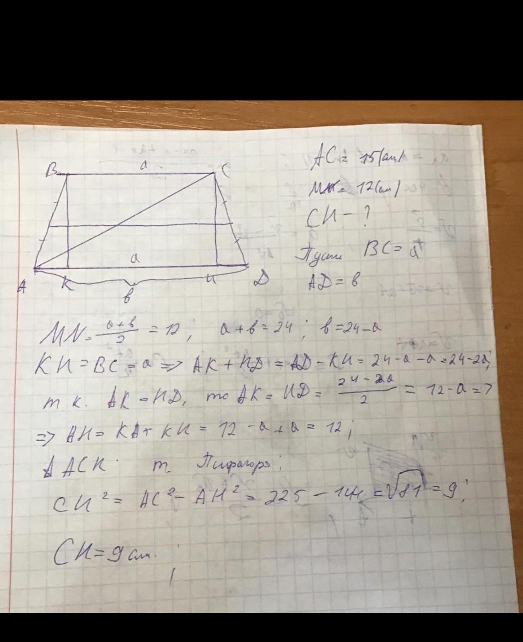 Діагональ рівнобедреної трапеції дорівнює 20 см, середня лінія — 16 см. Визнач відстань між основами трапеції.