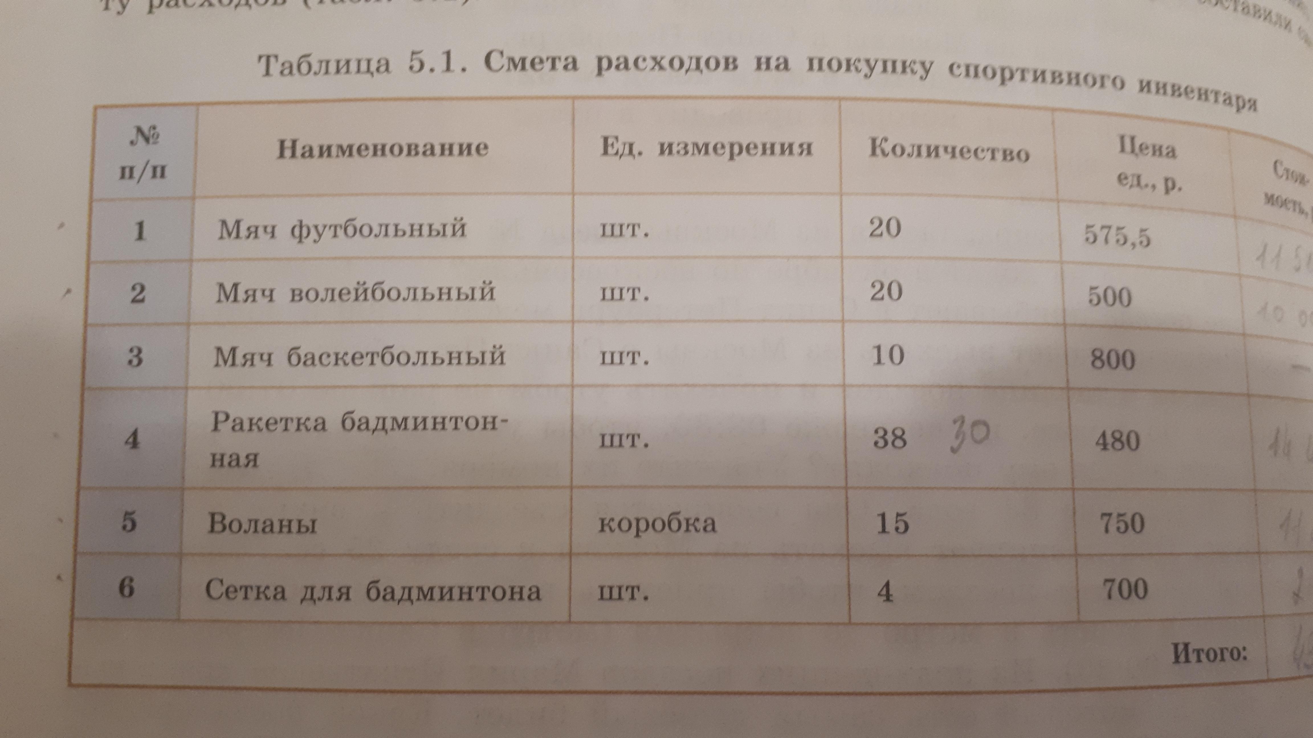 Преддожите какой нибудь способ составления сметы по таблице 5.1 так, чтобы были куплены волейбольные и футбольные мячи, ракетки, воланы и сетки чтобы общая сумма покупки равнялась ровно 50000