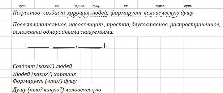 Искусство это подлежащее и подчеркивается одной чертой, создаёт это сказуемое, подчеркивается двумя чертами, хороших это определение подчеркивается волнистый линией, людей это дополнение, подчеркивается хтрих пунктиром, формирует-сказуемое, подчеркивается двумя чертами, человеческую-определение и подчеркивается волнистый линией, душу это дополнение, подчеркивается штрих пунктиром. Предложение является повествовательным, невосклицательным, простым с однородными сказуемыми, распространённым и дсусоставным. Я не уверена, что каждая школа делает разбор именно так.