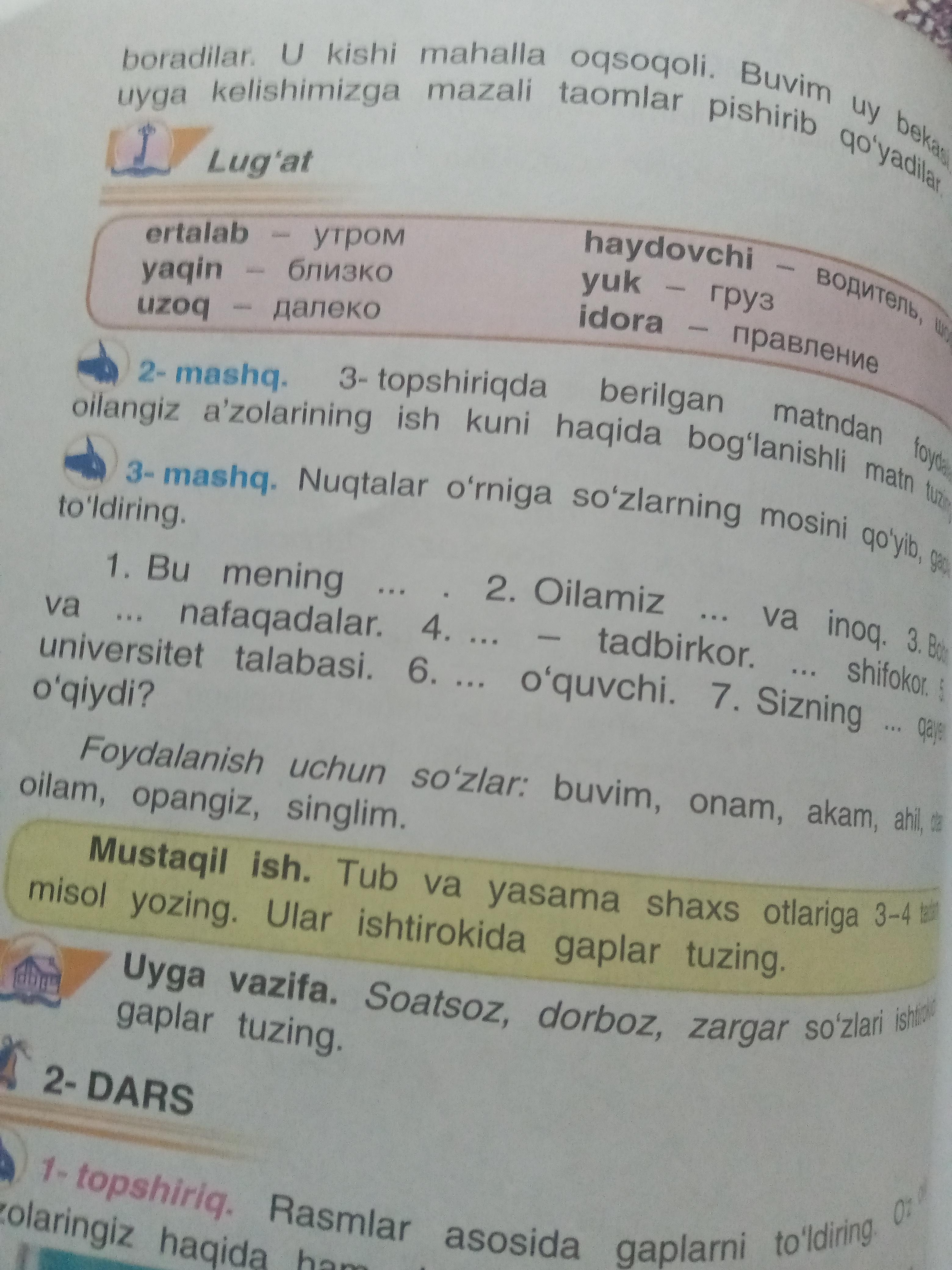 3-mashq nuqtalar orniga sozlarning mosini qoyib, gaplarni toldiring