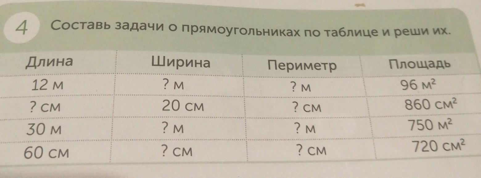 4 Составь задачи о прямоугольниках по таблице и реши и Длина Ширина 2 м 12 м 2 см 30 м 60 см 20 см 2 м 7 см Периметр 2 м 7 см ?M 2 см Площадь 96 м 860 см 750 720 см