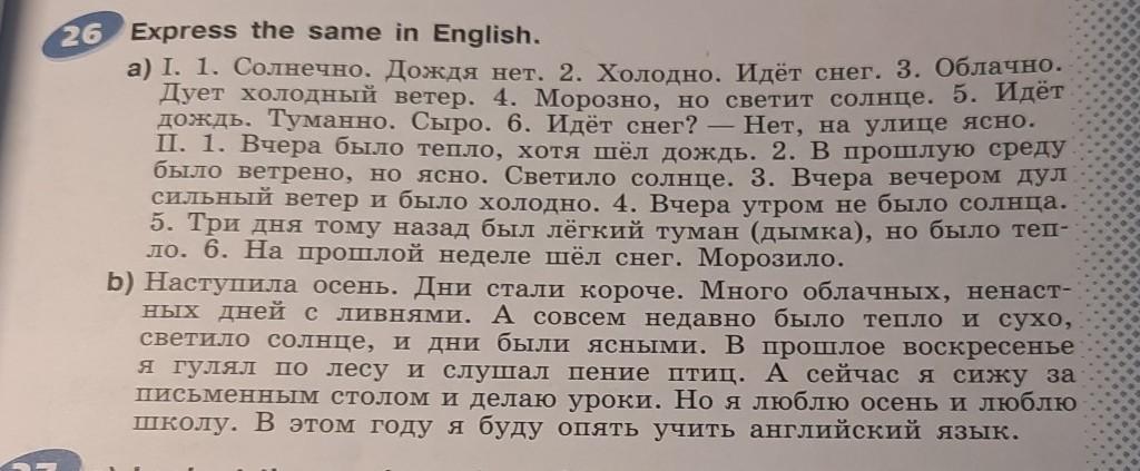 Exp express the same in english. a) i. 1. sunny. rain 2. it's cold. Snow is falling. 3. cloudy. a cold wind is blowing. 4. it's frosty, but the sun is shining. 5. it's raining. it's foggy. damp. 6. is it snowing? - no, it's clear outside. ii. 1. yesterday it was warm, although it was raining. 2. last Wednesday it was windy, but clear. the sun was shining. 3. last night there was a strong wind and it was cold. 4. there was no sun yesterday morning. 5. three days ago, a light fog (haze), but it was warm. 6. it snowed last week. it was freezing. b) autumn has come. the days have become shorter. there are many cloudy, inclement days with showers. and just recently it was warm and dry, the sun was shining, and the days were clear. Last Sunday I was walking in the forest and listening to the birds singing. and now I'm sitting at my desk and doing my homework. but I love autumn and I love it . school. This year I will be learning English again.
