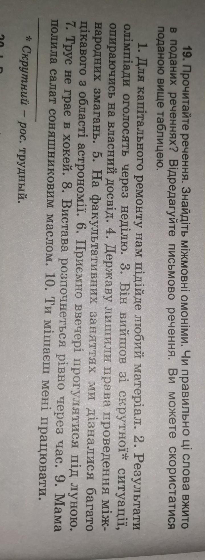 1. Для капітального ремонту нам підійде (підходить) будь який матеріал. 2. Результати олімпіади оголосять через тиждень. 3. Він вийшов із скрутної ситуації, враховувати власний досвід. 4. Державу позбавили права проведення міжнародних змагань. 5. На факультативних заняттях ми дізнались багато цікавого з галузі астрономії. 6. Приємно в ввечері прогулятися під місяцем. 7. Боягуз не грає в хокей. 8. Вистава розпочнеться через годину. 9. Мама полила салат соняшниковою олією. 10. Ти заважаєш мені працювати.