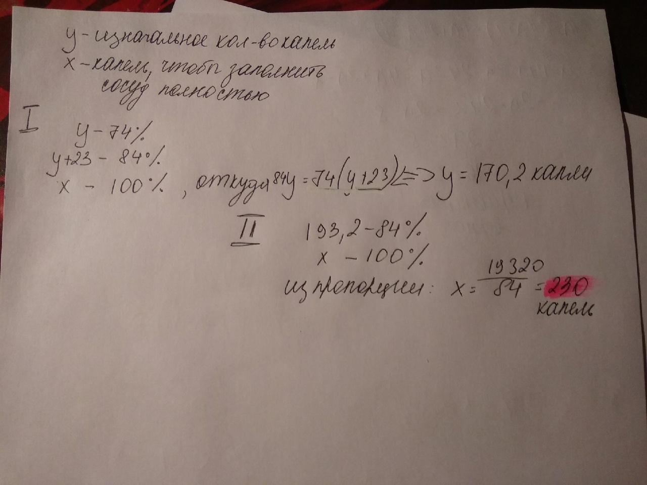 Сосуд заполнен был заполнен водой на 76 процента. В него налили 23 капли воды и теперь сосуд заполнен на 84 процента. Сколько нужно капель, чтобы заполнить сосуд на 100 процентов?