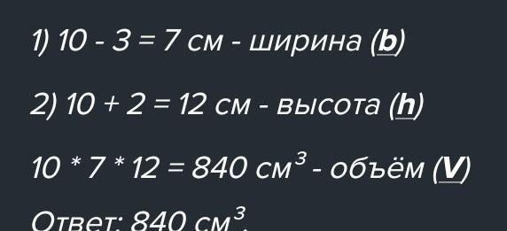 Обчисли об'єм прямокутного паралепіпеда, довжина якого дорівнює 10см,ширина-3см,а высота-у 2 рази менша, ніж довжина.