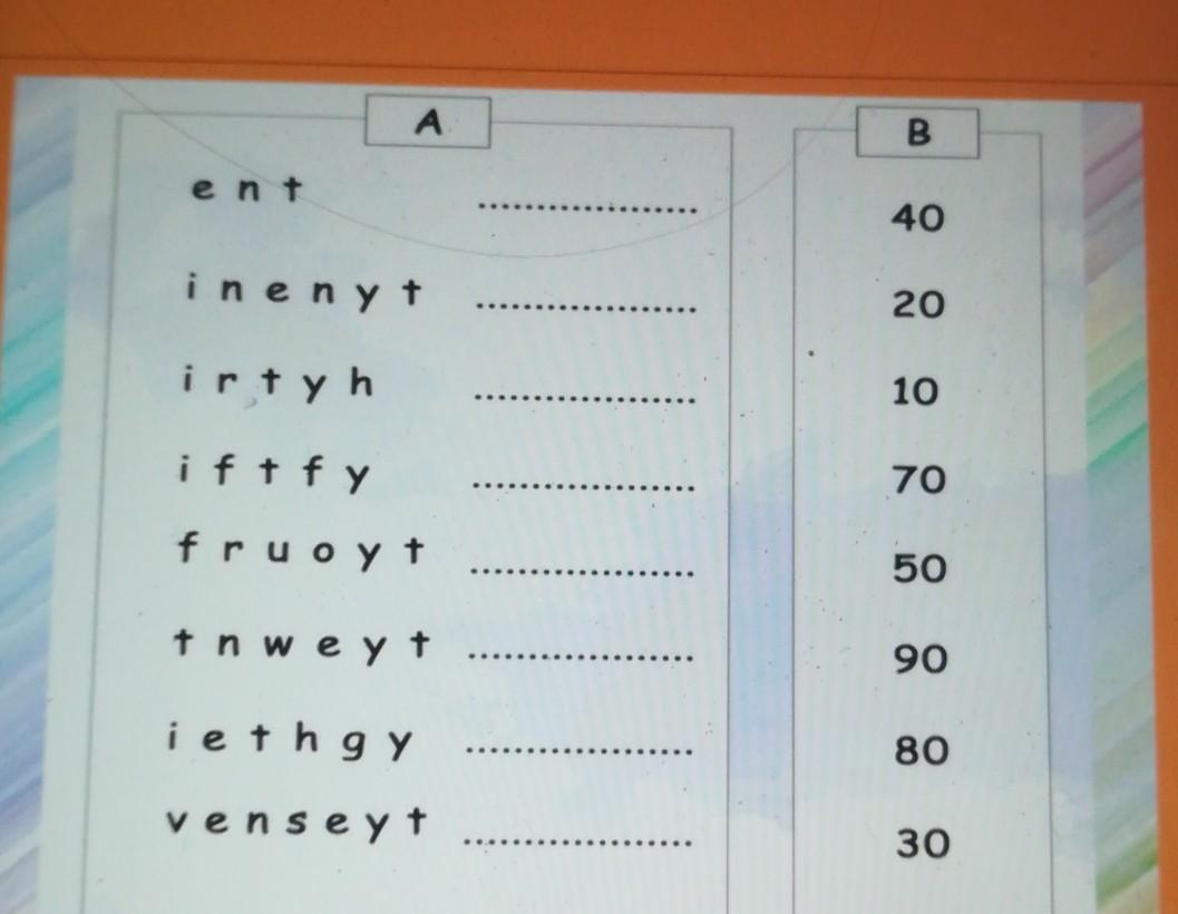 DECIPHER THE LETTERS IN COLUMN A TO FORM THE NAMES OF THE NUMBERS, AND MATCH THEM WITH THE NUMBERS IN COLUMN B. (РАСШИФРУЙТЕ БУКВЫ В столБЦЕ А, ЧТОБЫ СФОРМИРОВАТЬ НАЗВАНИЯ ЧИСЕЛ, И сопосТАВЬТЕ Их с числАМИ В СТОЛБЦЕ В) А B ent 40 inenyt 20 irty h 10 ift fy 70 fruoyt 50 t n we yt 90 ieth gy 80 venseyt 30