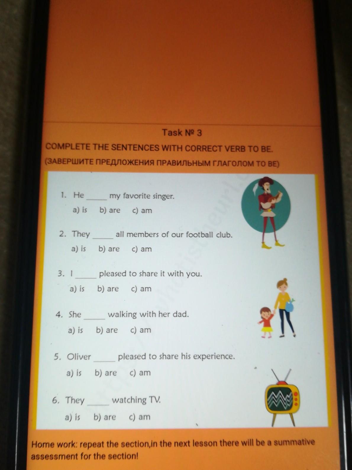 Task Nº 3 COMPLETE THE SENTENCES WITH CORRECT VERB TO BE. (ЗАВЕРШИТЕ ПРЕДЛОЖЕНИЯ ПРАВИЛЬНЫМ ГЛAГолом TO BE) 1. He my favorite singer. a) is b) are c) am 2. They all members of our football club. a) is b) are c) am 3. pleased to share it with you. b) are c) am a) is 4. She walking with her dad. a) is b) are c) am 5. Oliver pleased to share his experience. a) is b) are c) am o 6. They watching TV. a) is b) are c) am