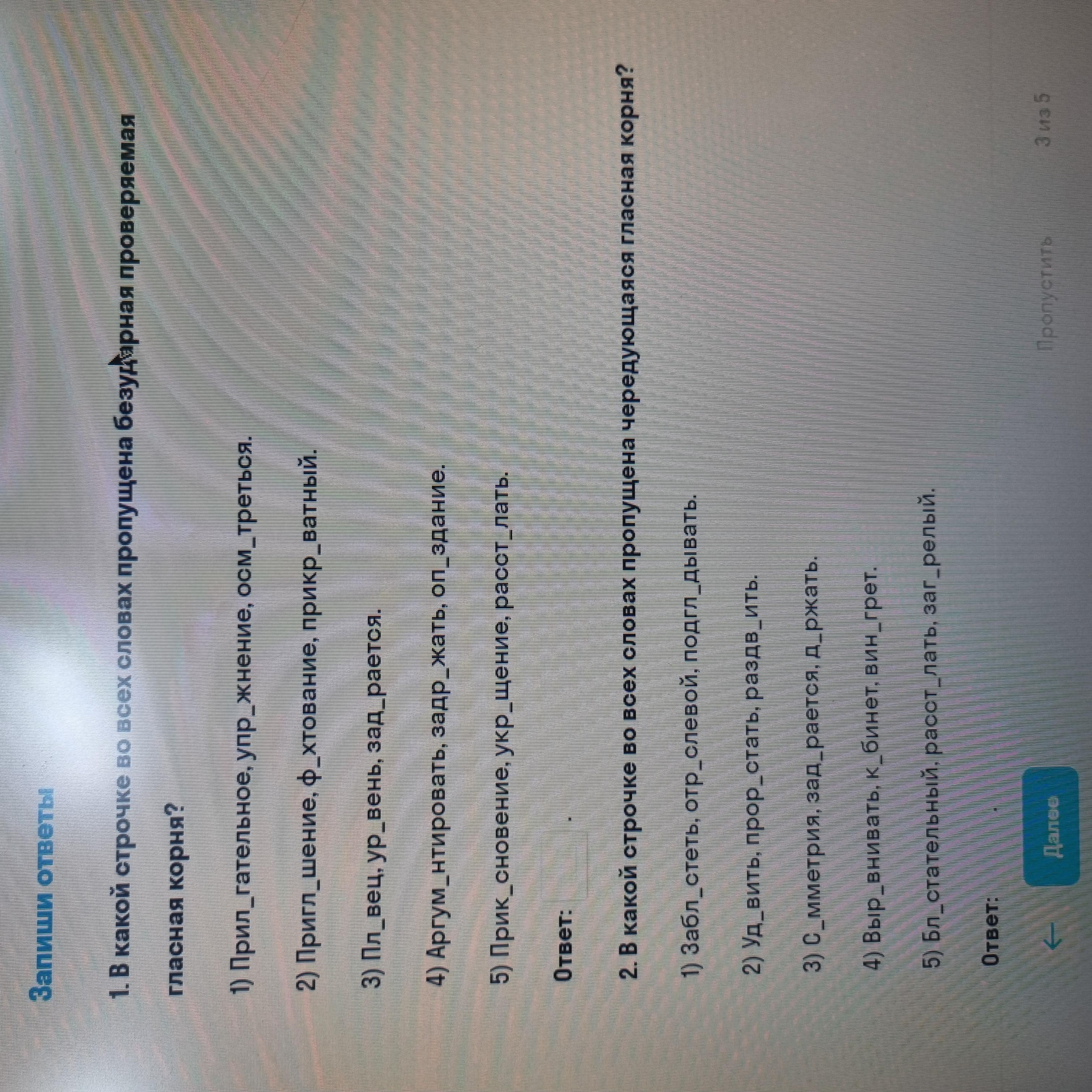 2) 5 (блистАтельный (суффикс А), расстилАть (суффикс А), заГОРелый (чередующийся корень ГОР)
