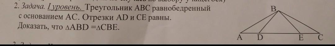 Следовательно, ΔABD = ΔCBE по 1 признаку равенства треугольников.